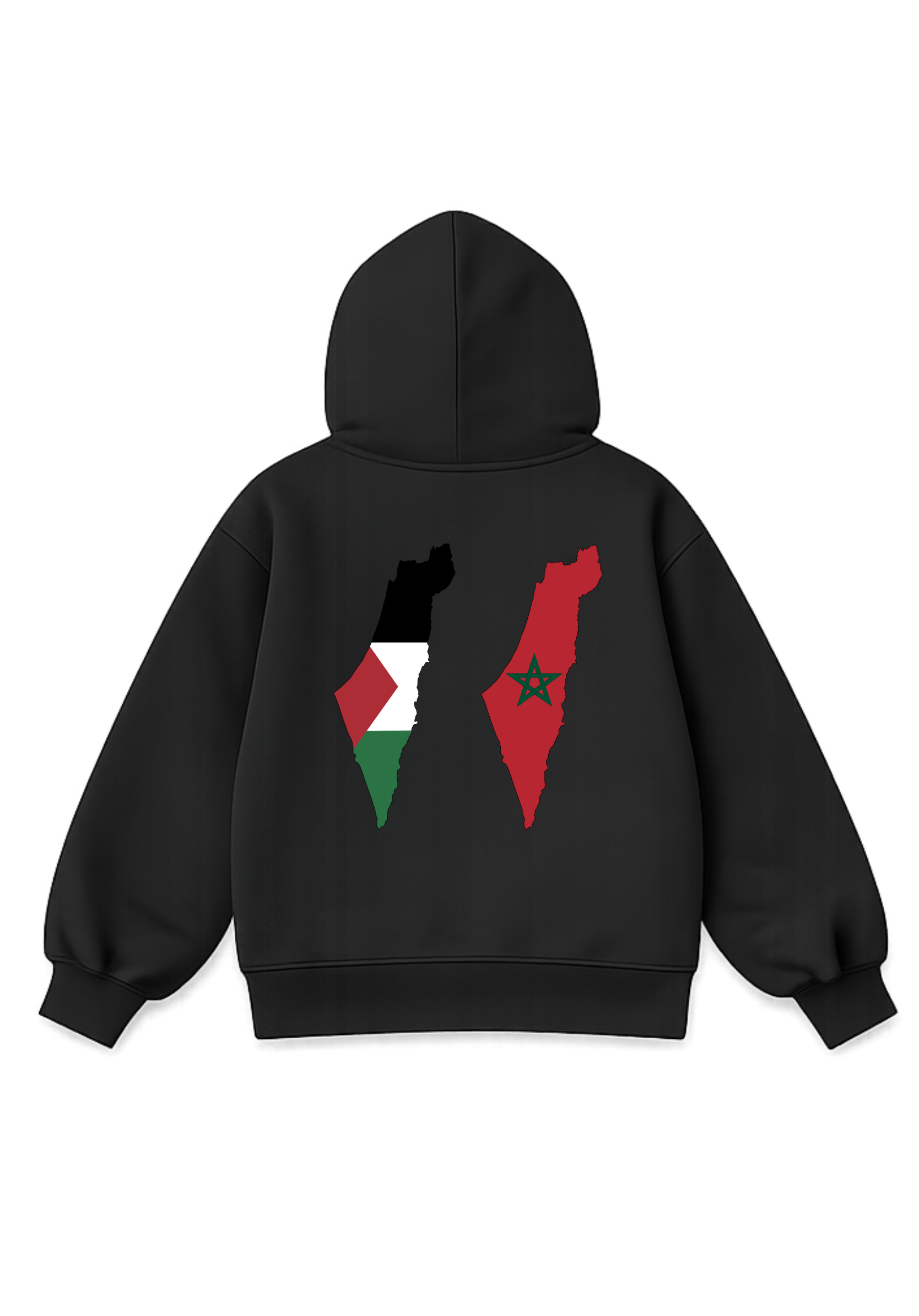 Au dos, un visuel puissant : deux drapeaux en forme de la Palestine. L’un avec les couleurs de la Palestine, l’autre un pays du Maghreb au choix (Algérie, Maroc ou Tunisie), symbole d’unité, de solidarité et de fierté partagée.